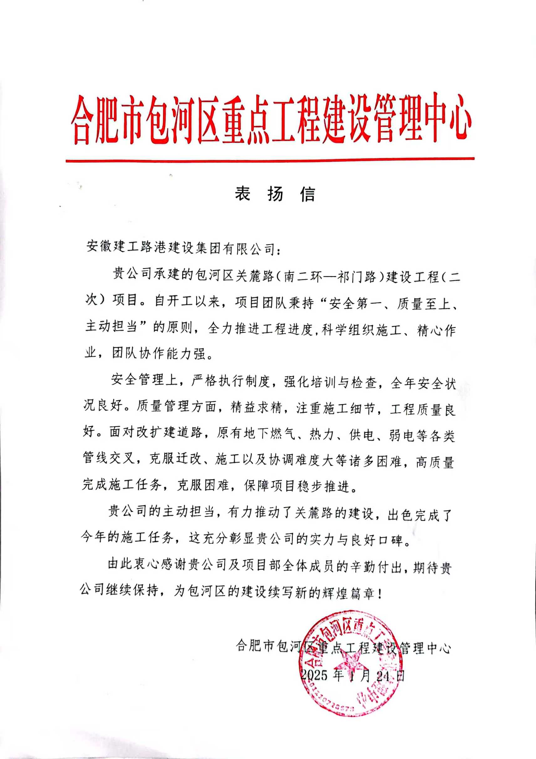 建工路港包河區(qū)關(guān)麓路建設(shè)工程項(xiàng)目收獲業(yè)主表?yè)P(yáng)信