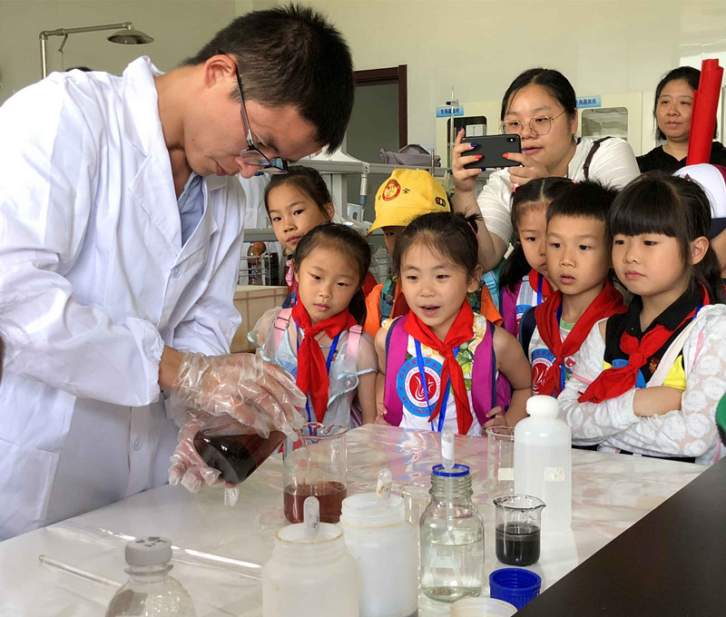 “經(jīng)過三天三夜,混濁的污水就這般變得干凈了。現(xiàn)在,讓我們把這個(gè)時(shí)間縮短,來一次奇跡的見證。”實(shí)驗(yàn)室里,學(xué)生們圍繞在實(shí)驗(yàn)試劑的瓶瓶罐罐旁,平日里嚴(yán)謹(jǐn)?shù)膶?shí)驗(yàn)技術(shù)人員瞬時(shí)變成了神奇的魔術(shù)師。“這就是我們平時(shí)未經(jīng)處理的工業(yè)印染污水,只有通過一系列的污水處理環(huán)節(jié),污水才能被排放至河流和大海中。”實(shí)驗(yàn)室技術(shù)人員拿出用作處理污水的專業(yè)試劑,開始帶領(lǐng)學(xué)生做“污水絮凝沉淀”實(shí)驗(yàn)。用膠頭滴管吸取試劑,使用玻璃棒攪拌、靜置,通過一系列的專業(yè)步驟,一杯杯污水慢慢地開始變清。“這就是絮凝沉淀實(shí)驗(yàn),通過加入‘混凝劑’,水中的污染物被不斷凝聚,最終沉淀至燒杯底部,從而使污水變清。”學(xué)生們一邊認(rèn)真聽講一邊情不自禁“哇,水變清