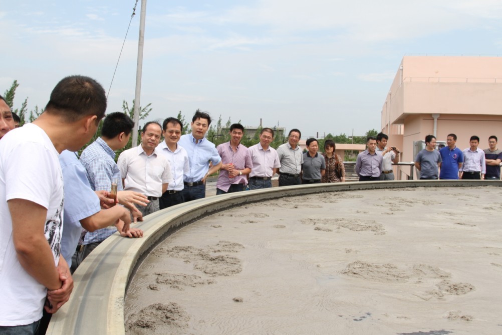 ,福全鎮黨委書記王勤率企業家代表一行40余人到紹興水處理公司調研氣浮項目。調研組實地參觀了污水處理一期穩流池和氣浮工程現場,仔細聽取了技術人員對工藝技術的講解,并對經氣浮工藝處理前、后水樣進行觀測。隨后,調研組一行在四樓會議室進行座談,進一步了解有關情況。會上,印染企業老總紛紛表示,通過這次考察和交流,了解了污水處理的新工藝、新技術,對政府提出的納管新要求充滿了信心。